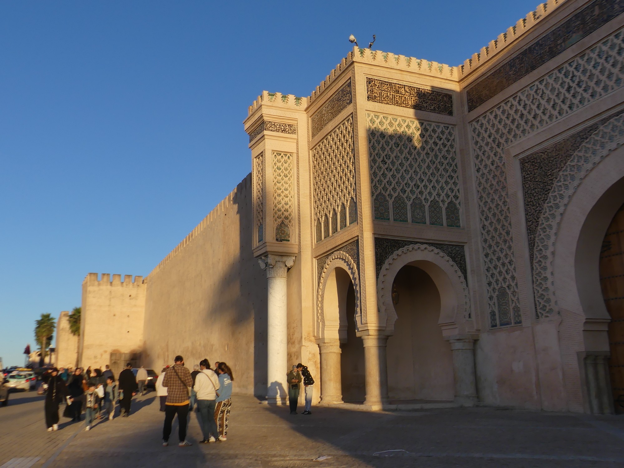 même programme le lendemain, mais avec le soleil en plus et sous le ciel bleu, à aller me perdre un peu plus profond... Comme à Rabat, la ville comporte des kilomètres de remparts et un petit tas de portes travaillées. La médina, habitée et vivante est très agréable, colorée, à taille humaine. Mon séjour à Meknès fut donc plaisant… ce n’était pas une raison pour y laisser un t-shirt technique manches courtes jaune pétant Espace Évasion que je regrette déjà ! Je m’en veux, je ne comprends pas, je regarde systématiquement par terre, sous le lit, sur le lit, et je ne l’ai pas vu, c’est une énigme, un mystère…