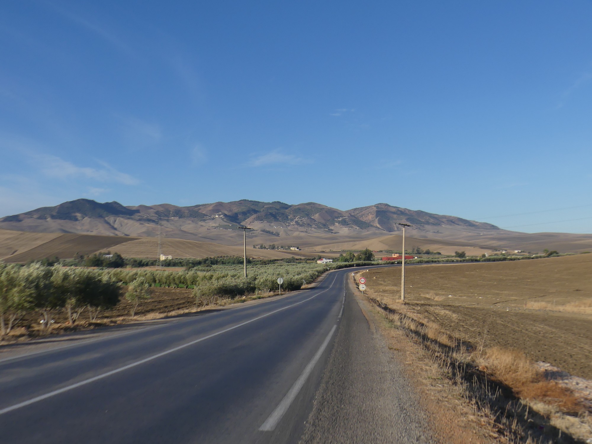 Je commence donc par une étape de 110 km qui aboutit à Souk El Arbaa, rondement menée avant d’avoir du vent latéral trop fort, par la nationale d’abord calme, et qui s’est chargée au fil des heures sans devenir un problème. Le vent m’a d’abord aidée, mais j’ai ensuite dû appuyer, pour finir par me battre un peu. Un seul hôtel répertorié, annoncé comme un taudis. Effectivement. État de saleté et de délabrement très avancés. J’aurais pu prendre une “duche”, vu qu’y avait pas d’o, fenêtres explosées, bref, à se demander comment ils peuvent encore avoir l’autorisation d’ouverture au public… Mais de l’autre côté de la rue, je vois “café/hôtel”. Donc je traverse, et me voici logée dans un hôtel simple mais propre, avec douche eau chaude sur le palier, une petite chambre simple avec lavabo, table, chaise, miroir, fenêtres et volets qui ferment, au second pour ne pas entendre le bruit du foot à la télé au bar, toit terrasse avec fil pour étendre ma lessive, accueil sympathique, prix modique, c’est parfait. Et s’il faut rester là jusqu’à mardi matin à attendre que le déluge passe, ce ne serait pas bien grave… je vais d’ailleurs y réfléchir car il y a un bon resto à côté, et le marché est bien fourni en fruits et légumes.