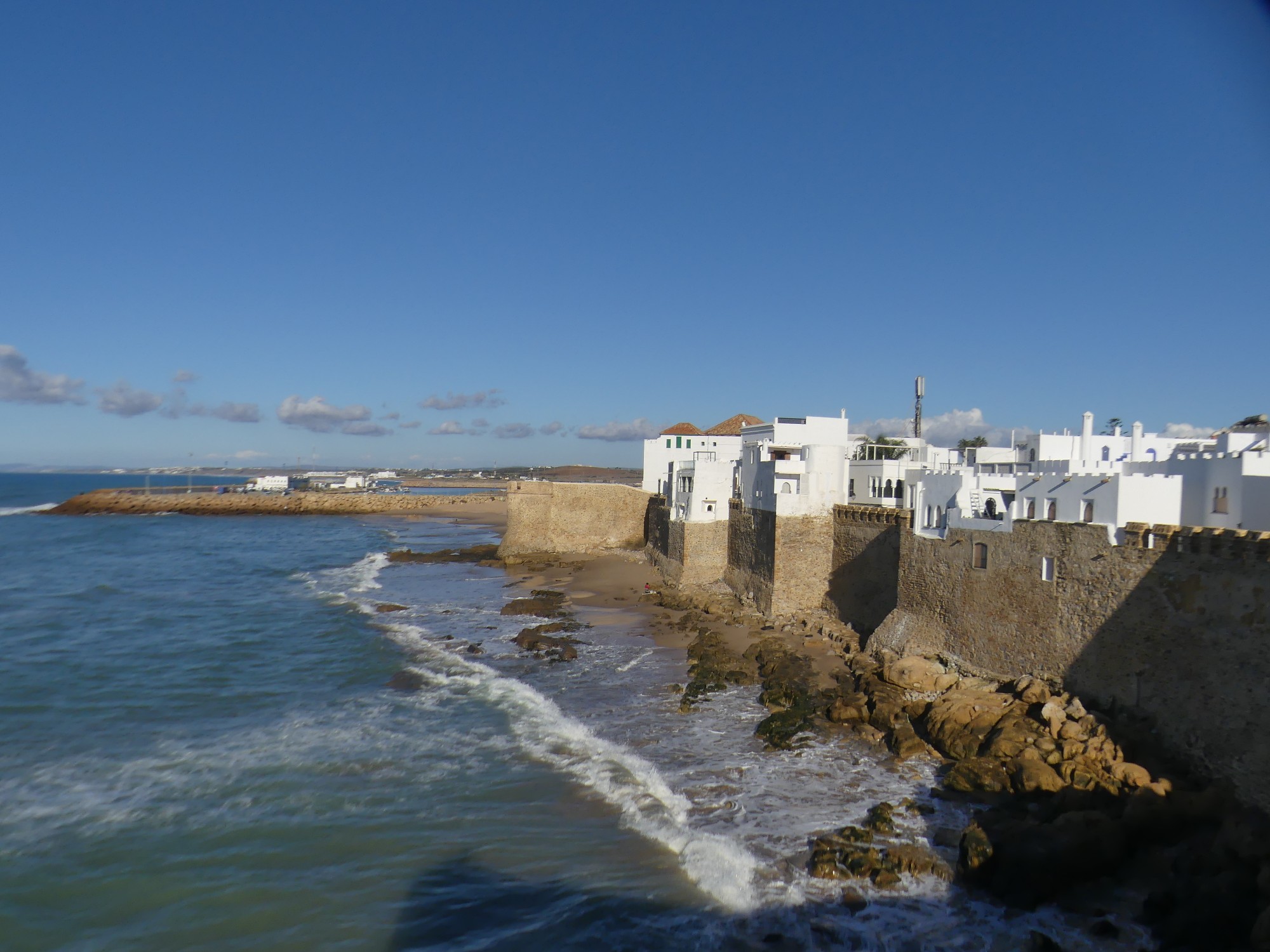 Mardi 18, je remonte sur mon vélo pour faire 42 km seulement. Au matin, les routes sont encore détrempées des pluies intenses de la nuit mais le soleil est là et le vent faible m’est favorable. J’arrive à Asilah vers 11 h 30 et file direct à l’hôtel dont on m’a dit du bien. Toutes les chambres sont libres. Je prends la moins chère, toutes sont propres. J’ai des draps, une serviette, un lavabo, une