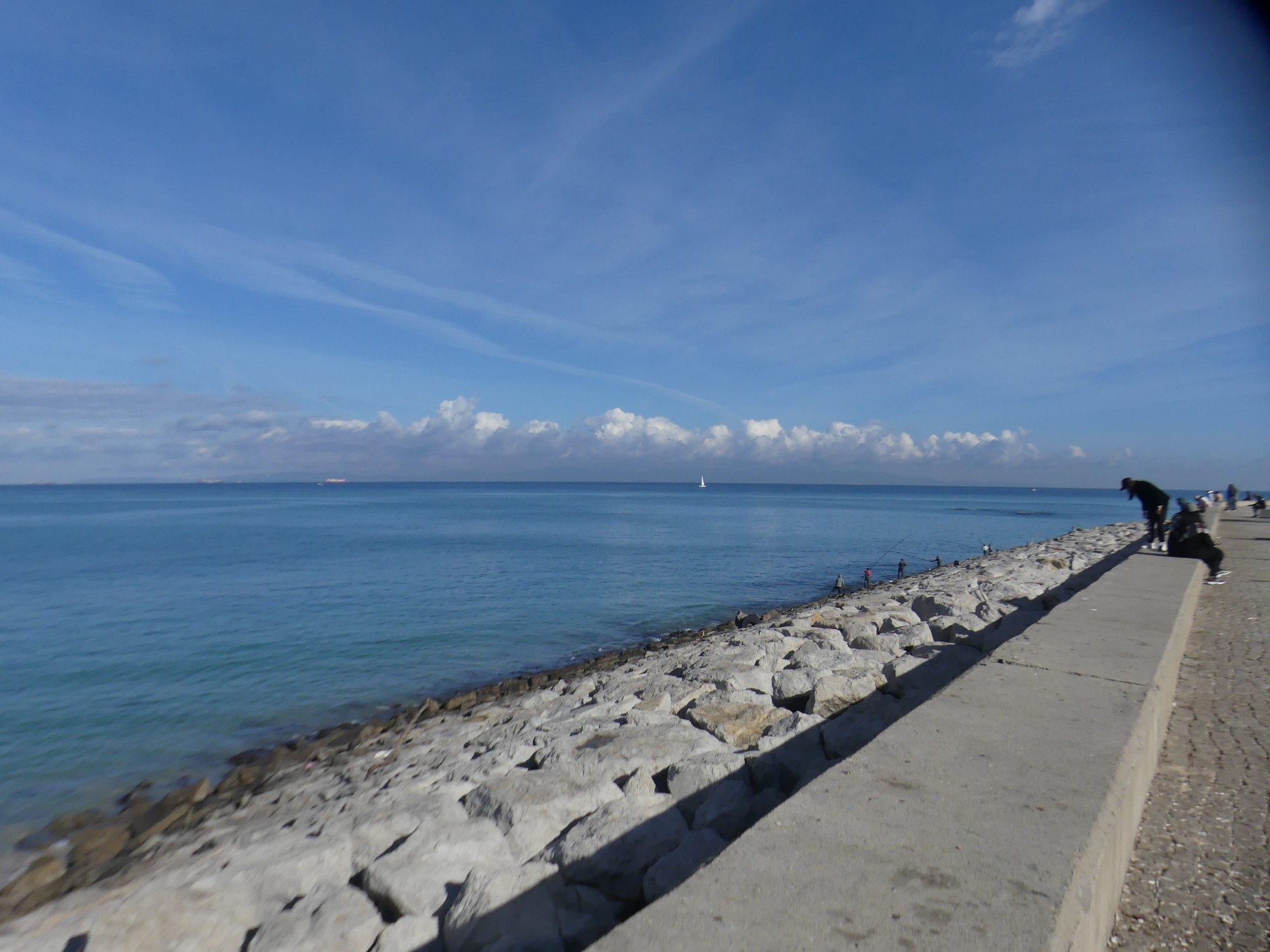végétation, mais côté méditerranée, on a une belle forêt et une côte rocheuse. Alors c'est marrant, pourquoi ce serait juste là la jonction des eaux de la mer et de l’océan ? Qu’est ce qui fait dire ça ? Eh ben en observant l’eau justement, on peut voir des remous qu’il n’y a pas ailleurs, ça clapote, ça fait des petits courants circulaires, juste là, sur une centaine de mètres de large. Serait-ce donc ça ? L’atmosphère est bien limpide aujourd'hui encore, la côte espagnole très distincte du rocher britannique jusqu’à Cadix. Et puis il y a un radôme et des antennes sur un sommet tout proche alors je pourrais me croire à Poêle Chaud, avec la Dôle, le Léman (détroit), et l’Espagne c’est les Préalpes… Bon, j’ai continué, suis descendue jusqu'à la mer, comptant emprunter ensuite le sentier côtier jusqu’à Tanger. Je suis tombée sur des tentes faites de bouts de tissu, de bâches, de cartons. Des mecs vivent là ! Il y a plein de pêcheurs. Les mêmes ? Je me demande s’ils vivent là et pêchent pour assurer leur subsistance ou s’ils utilisent ces abris quand ils viennent pêcher… Certains ont l'air de vivre là. Toujours est-il que mon cheminement est empêché par des rochers surplombant la mer alors je dois tout remonter. Arrivée en haut, je chope le bus pour 3 km de route. Tout se passe bien un moment, mais ensuite, je suis encore empêchée par les forces auxiliaires qui m’interdisent un sentier. Décidément, je ne pourrai pas marcher le long de la mer, je dois me contenter du macadam entre deux murs de 4 mètres de haut. Il y a un militaire tous les cinquante mètres. Alors tant pis, je