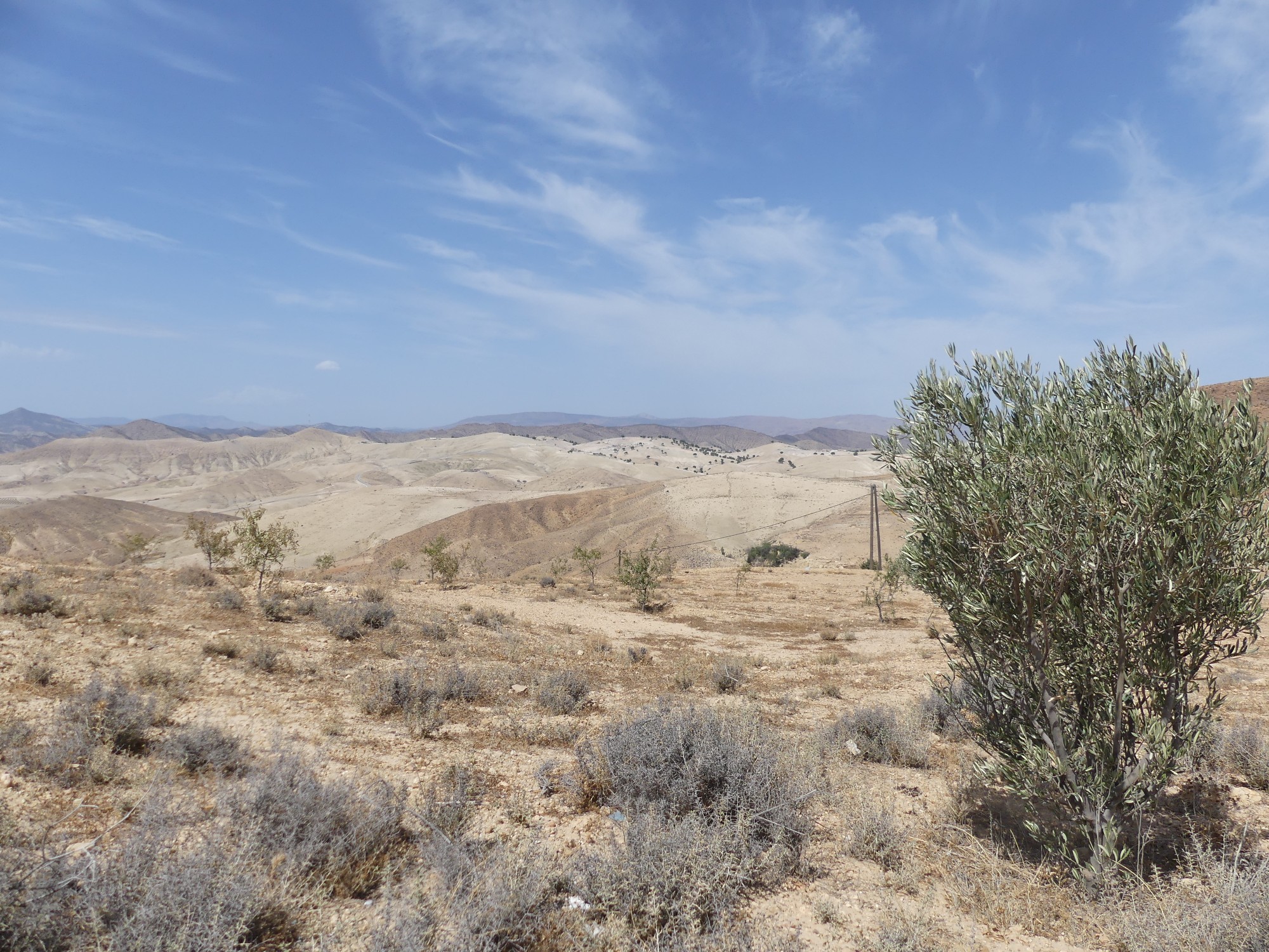 Aint Zorha - Mezguitem. J’ai reconnu le café où nous avions pris un thé, le village, la rampe à l’entrée et la bonne bosse pour monter au col à 1150 m, où j’attends longtemps mes coéquipiers. Arrêt, adossés au mur de la même mosquée que l’an dernier et même plaisir dans la descente qui suit. La succession de bosses infernales avant Mezguitem est toujours aussi éreintante. Jusque là nous avons profité d’un vent favorable mais il a tourné. Nous avons maintenant vent de sud et il est chaud. Nous trouvons là aussi l’hospitalité et même topo que la veille chez une famille toutefois plus riche, elle possède une Sandero en bon état. Comme la veille, ils refusent avec vigueur l’argent que nous proposons. Partir en proposant un dédommagement nous donne bonne consciences mais nous sommes tellement ridicules à leurs yeux… limite affront ! Là aussi j’ai préféré monter ma tente dehors qu’entre 4 murs qui restituent la chaleur accumulée la journée.