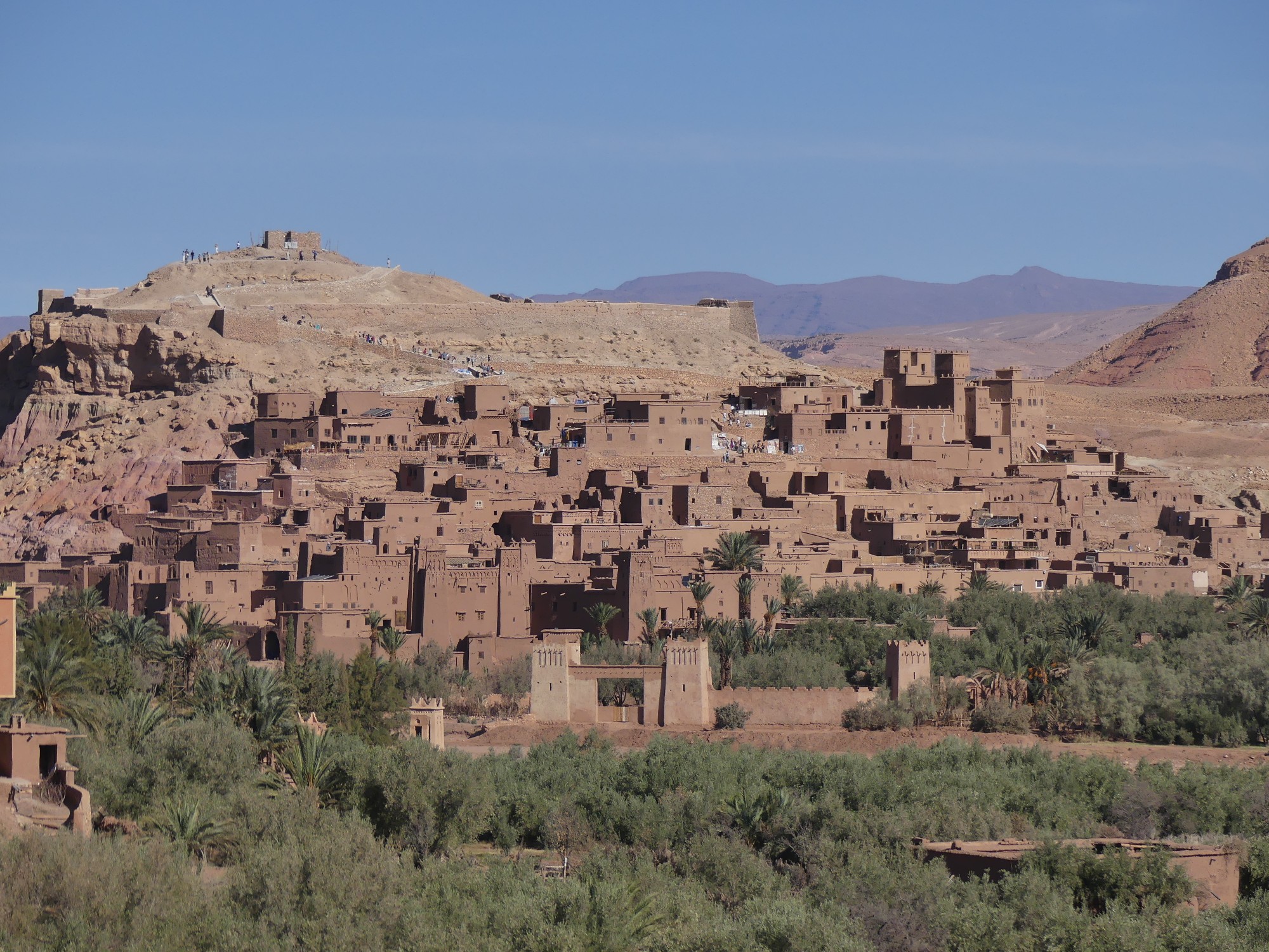 Le jour suivant, nous rallions Ouarzazate par 90 km de route nationale sans virage et vent en poupe, égayée seulement par des kasbahs imposantes. La palmeraie de Skoura est censée être une des plus belles du pays mais ils avaient oublié de passer le plumeau sur les palmiers, qui faisaient plutôt pitié. Arrivés et posés à Ouarzazate, nous retournons visiter la kasbah Taourirt, grand dédale,