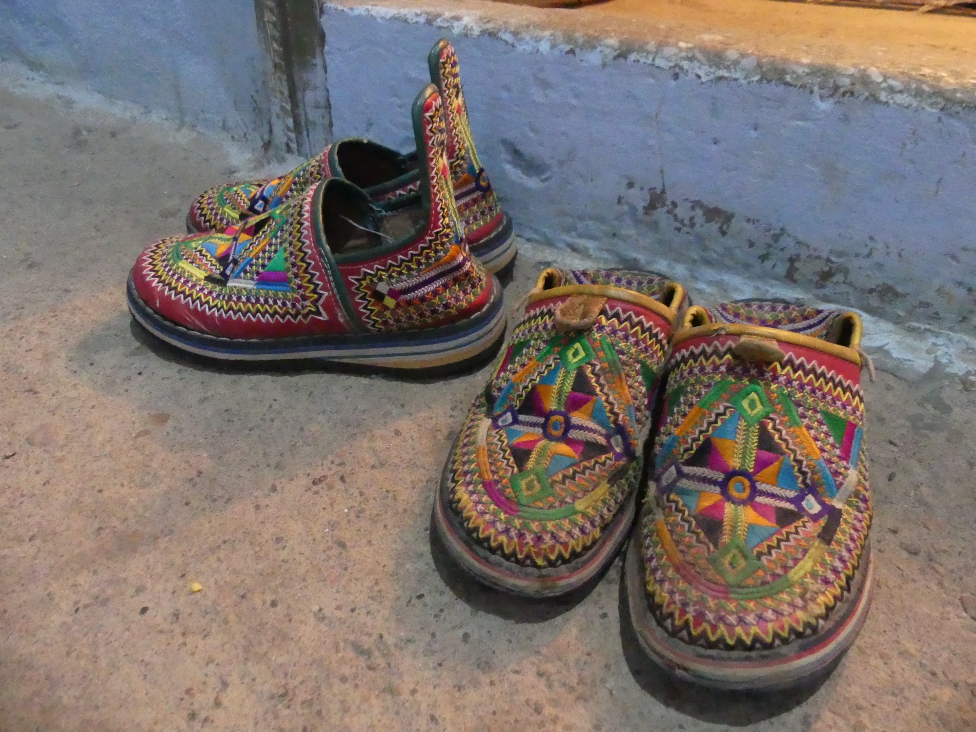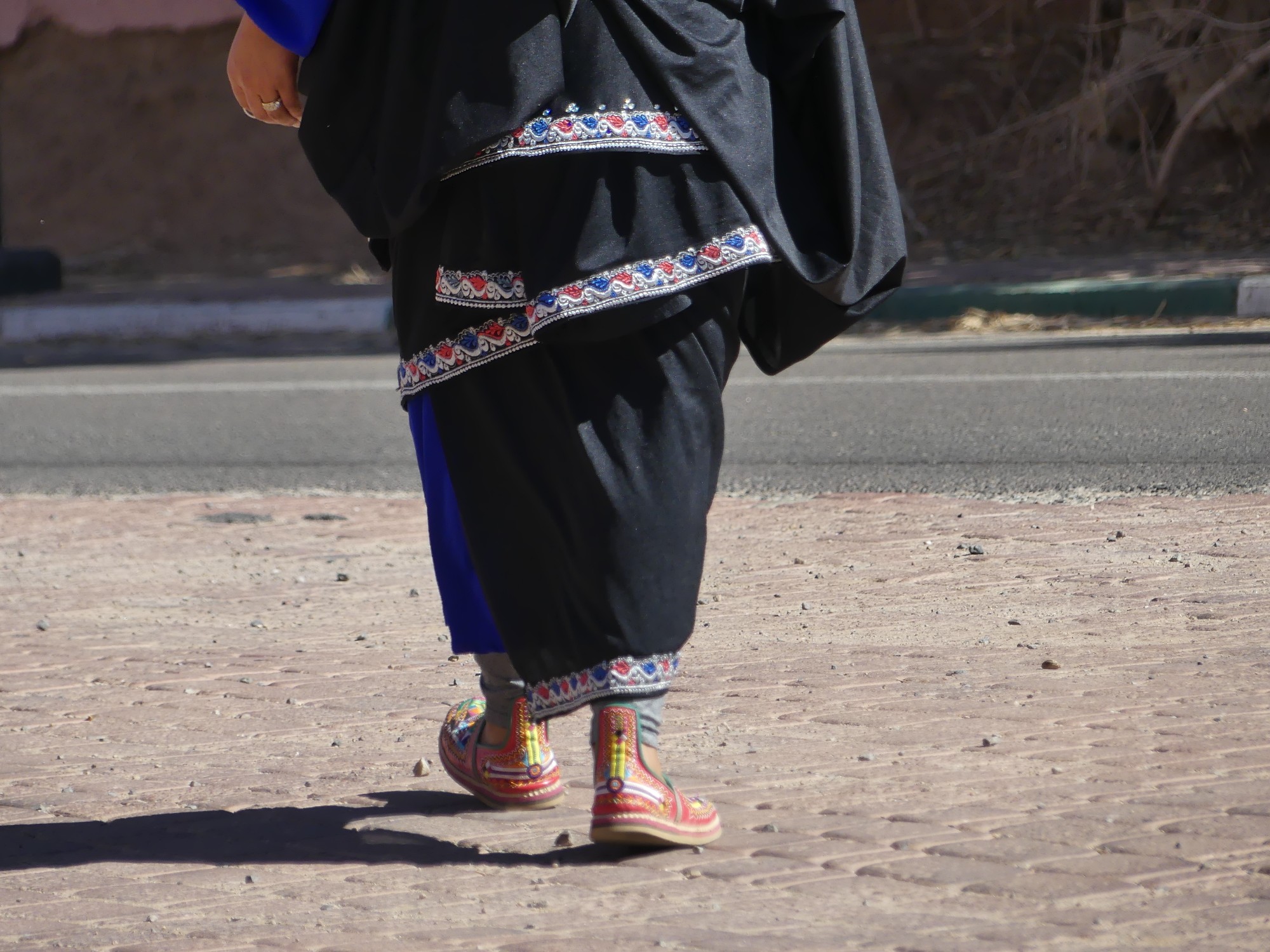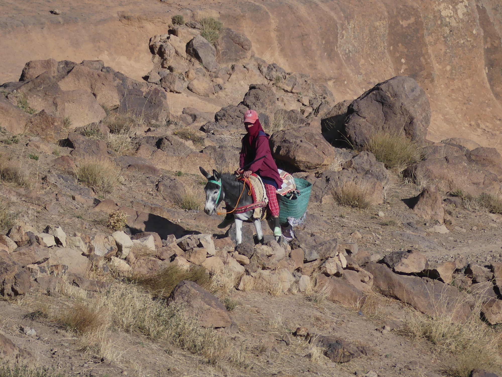 Heureusement, la route déserte, les hauts plateaux, la fraîcheur relative, le paysage, l’absence de vent me réjouissent et je me régale. Je rentre vraiment dans le cœur de l’anti atlas de Tafraout, je bifurque à droite pour aller voir d’un peu plus près cette partie du massif qui se distingue déjà par la couleur de sa roche, plus foncée. Dans les villages, les femmes portent des tenues qui pourraient s’apparenter à des nikabs, il n’en est rien, je passe dans la tribu des Ammelns, et c’est la tenue traditionnelle, toute noire, légèrement et finement brodée, avec aux pieds des babouches très colorées, superbes. À Ida Ougnidif ce jour-là, je suis accueillie dans la famille de la pharmacienne car il n’y a aucune possibilité d’hébergement dans la bourgade. Les trois femmes de la maisonnée sont excitées comme des puces d’avoir une française à la maison. Les deux jeunes parlent un peu français et anglais, ce qui permet de communiquer, et de leur dire d’arrêter de vouloir à tout prix fuir le Maroc pour la France ou l’Allemagne, le rêve pour beaucoup. Comme souvent, le dîner se prend tard, entre 20 et 21 heures, alors que je lutte depuis un moment contre l’endormissement !