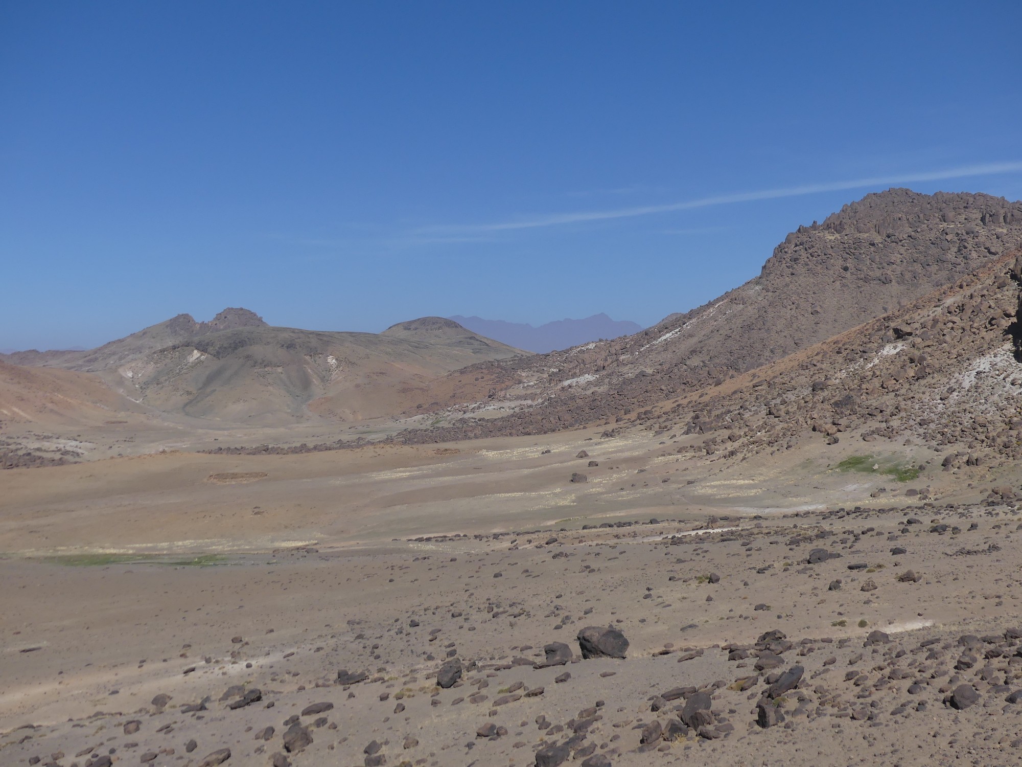 Le lendemain nous commençons par longer la grande Bleue sur un macadam velours et le vent dans le dos. Légers vallonnements agréables avant de rentrer dans les terres, de pousser le vélo sous le cagnard dans des pentes déraisonnables. Et je ne me souviens déjà plus de la suite ni du bivouac… ah si, en sortie de ville. Des habitants viendront nous offrir thé, cacahuètes et biscuits en soirée. Continuant notre route plein sud, après un premier col passé dans une cascade de nuages, nous dévalons vers Tafersite où Marie renvoie 4,5 kg de matos inutile en France. Courses à Midar où le soleil cogne trop fort, Jipe n'est pas au mieux, un bon rhume. Après la bascule en haut d’un col dont nous avons gravi la pente trop raide en partie à pied, nous pénétrons dans un secteur désertique.