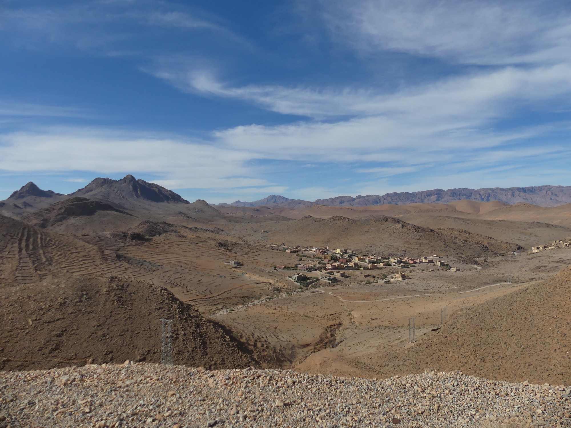 Après une nuit calme et tranquille, c’est reparti. Quelques kilomètres encore sur les plateaux vallonnés avant un plongeon spectaculaire au fond d’un canyon. Dans le patelin qui se trouve au fond, les orages de l’automne dernier ont fait des dégâts dans ce couloir étroit, route endommagée, les travaux sont toujours en cours pour remettre en état. Plus bas dans l’oued, des tas de troncs de palmiers, des débris… Le paysage change, l’oued à sec est maintenant très très large et j’arrive à Aït Tamanart où je retrouve un peu de vie, quelques échoppes et gargotes. À partir de là, c'est vent de face et ce sera ainsi jusqu’à la