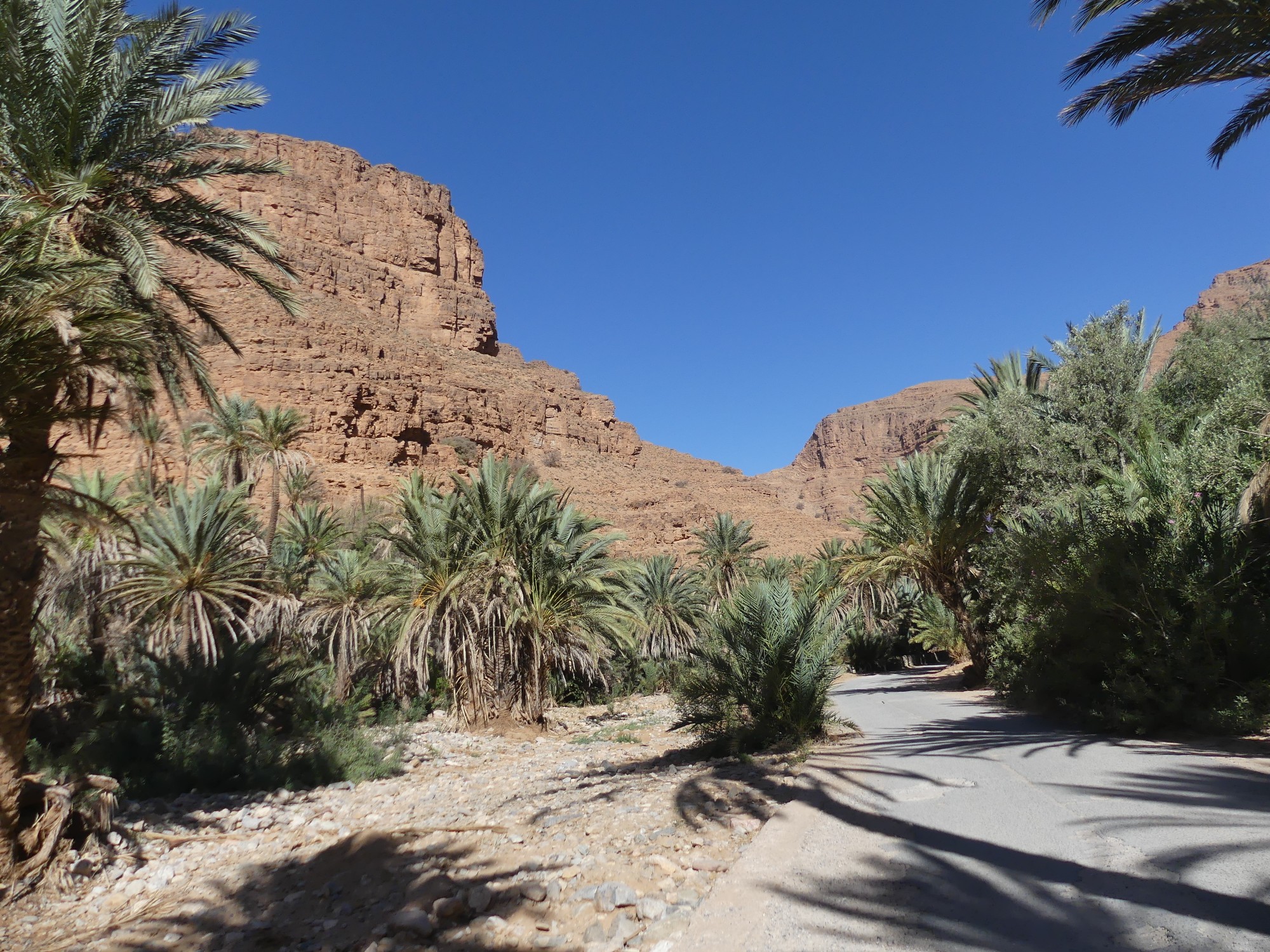 En ce lundi 20 octobre, je me remets en route, direction les gorges d’Aït Mansour. La première montée ne me surprend pas, 600 m de d+ pour basculer dans ces gorges impressionnantes, étroites et profondes, bordées de hautes falaises rouges, et au fond desquelles on trouve une palmeraie serrée comme une jungle, quelques hameaux, des canaux d’irrigation. Bref, le détour vaut le coup. Enfin… sauf que je n’avais pas vu le profil altimétrique et fut bien surprise, ayant déjà fait 900 de d+ aujourd'hui, d’avoir encore un col à 1610 m à passer… Soit. La fin pique un peu sous le cagnard de l’après-midi, mais il