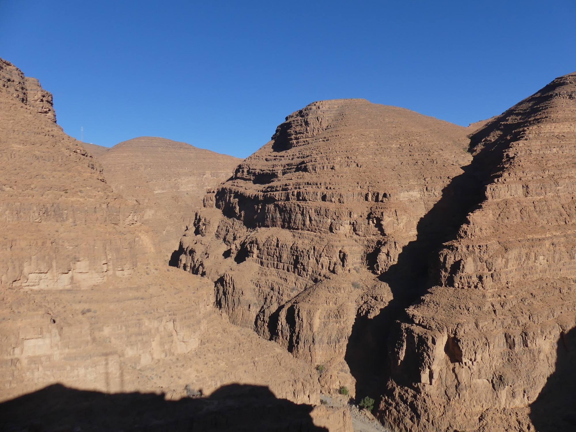 route est en macadam pourri, troué, percé, et les travaux durent 25 km, donc toute la montée et la descente suivante. Paysage de ouf, tant depuis le col à 2200 m, que dans la descente vertigineuse qui plonge vers Aït Abbas et la vallée de l’oued Lakhdar, profonde, cultivée, enjolivée par de nombreux hameaux pittoresques en terre battue. Je suis bel et bien dans le Haut Atlas. Quelques rencontres sympathiques, quelques verres de thé bienvenus. Il faut maintenant remonter cette vallée pour atteindre la vallée heureuse que je reconnais pour l’avoir parcourue l’an dernier. Je me pose dans un gîte et comme toutes les chambres sont pleines, je me vois conviée à dormir dans l’appartement familial, qui fourmille de femmes. Accueil royal comme d’habitude. Il faudra juste attendre 20 h 30 pour manger le tajine avec les autres touristes, la cuisson est longue, c’est le secret du goût du tajine, il faut que ça