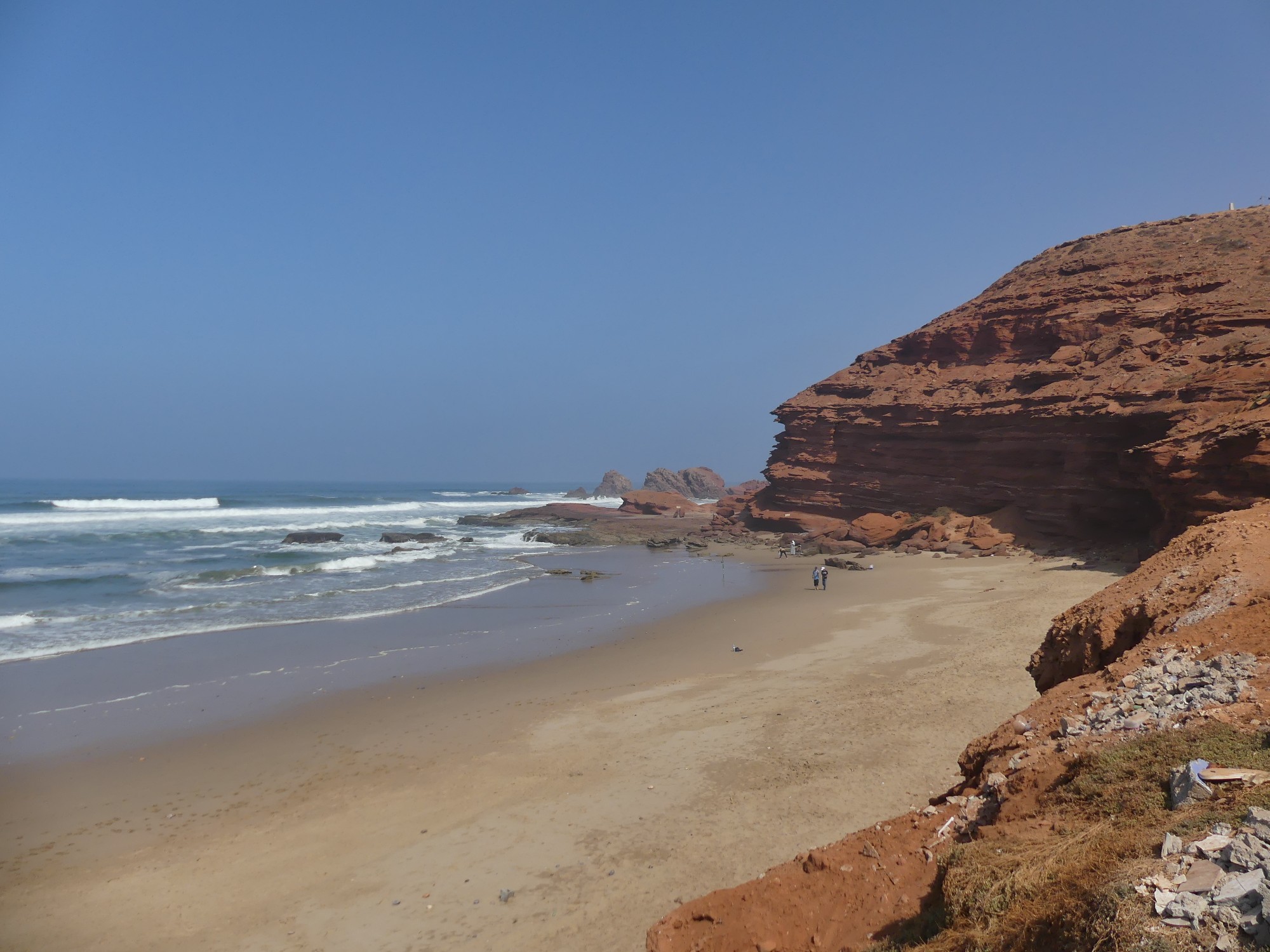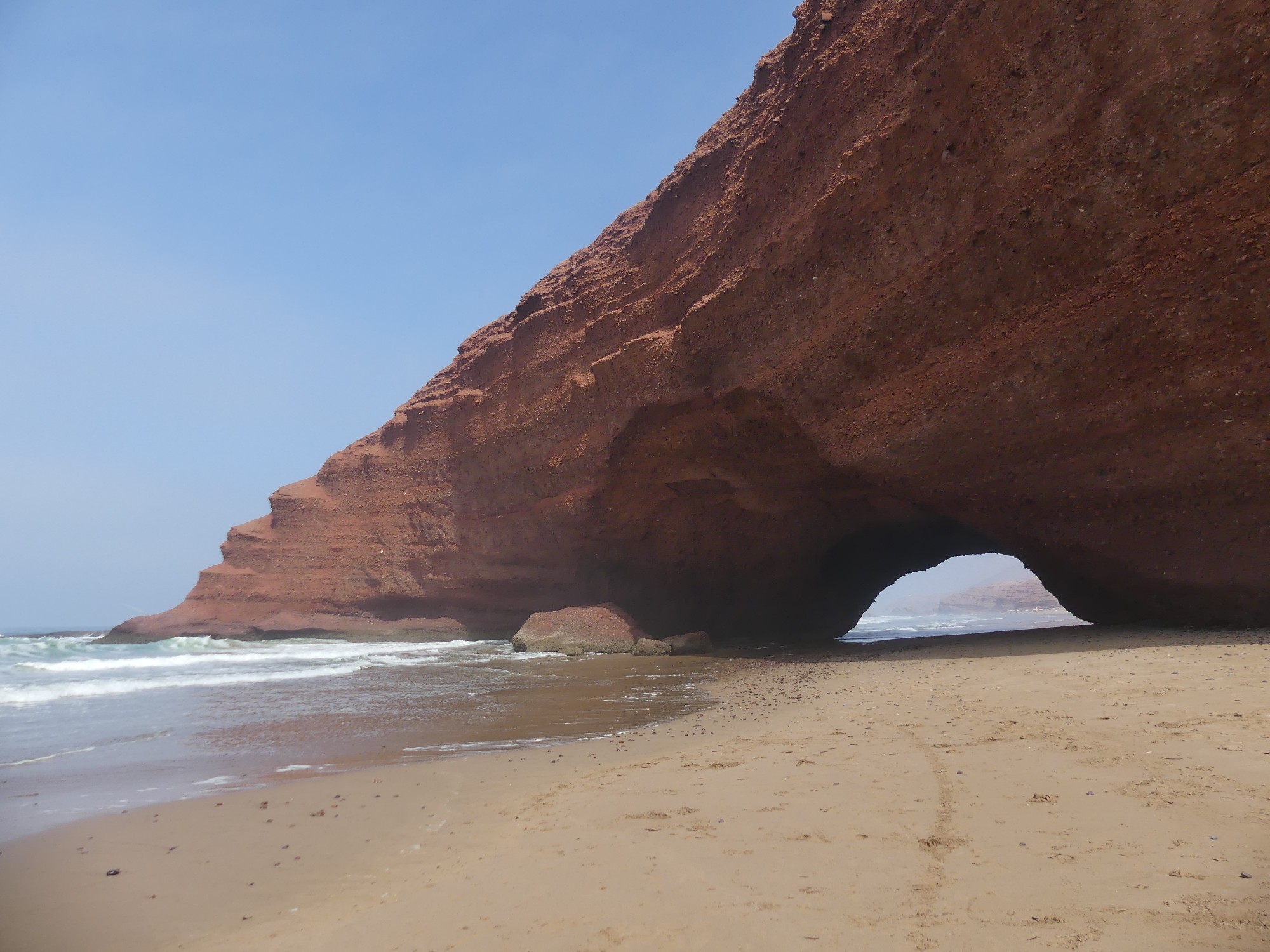 Sidi Ifni, du blanc et du bleu, et du soleil qui a enfin percé les brumes. Pause omelette et lentilles. Puis la plage et surtout l’arche de Lezgira. Une voûte naturelle d’une trentaine de mètres de large, autant de long et une quinzaine de haut. Joli site. Je ne regrette pas le